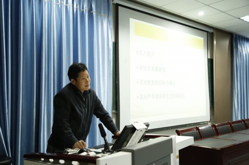 张银龙常务理事作了题为“太湖湖滨湿地恢复与管理”的报告。他首先从科学与管理两个方面系统阐述了湿地的概念及为人类提供生态服务功能的重要性,然后针对太湖湖滨湿地生态系统严重退化的现实,与师生分享了对太湖湖滨湿地生态恢复的总体思路、恢复目标和恢复模式的思考。报告内容精彩、生动形象、通俗易懂,赢得师生热烈掌声。