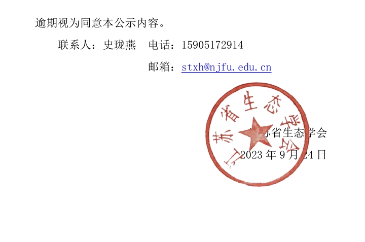 根据《关于开展2023年江苏省自然科学百篇优秀学术成果论文推选工作的通知》(苏科协发[2023]119号)要求,江苏省生态学会在会员范围转发了该文件,经会员自愿申报、所在单位批准、学会进行资格审查、专家评审后,现公示2023年江苏省自然科学百篇优秀学术成果拟推选论文。公示日期从2023年9月24日至9月29日止。公示期内,任何单位或个人对上述拟推选论文持有异议的,应当以书面方式向我单位提出,并提供必要的证明文件,逾期视为同意本公示内容。