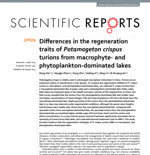 南京林业大学的谢冬博士,在最近的Scientific Reports(国际一流综合性学术期刊,Nature出版集团子刊,IF=5.787,JCR分区Q1)发表高水平学术论文。该论文对比了草型湖泊(湖北梁子湖)与藻型湖泊(江苏太湖)两湖内的沉水植物——菹草的石芽。野外调查结果发现长江中下游水体常见沉水植物菹草石芽在藻型湖泊条件下会出现小型化趋势,石芽组织内含有较多的总氮与总磷。通过萌发实验发现来自太湖的石芽能够较快萌发,但萌发出的幼苗较小,去除萌发幼苗会增加石芽的萌发率。这是由太湖石芽内含有较多的可溶性糖与游离氨基酸所致。并且去除石芽苞叶对萌发影响不显著。此结果反映了植物在不同生境下会采取不同的繁殖策略,使其后代存活最大化。该研究能进一步丰富富营养化水体中生物多样性保护的理论体系,也为制定有效的富营养化湖泊沉水植被管理及生态恢复策略提供了帮助。