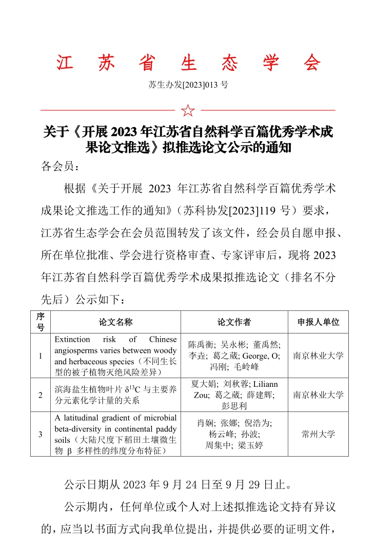 根据《关于开展2023年江苏省自然科学百篇优秀学术成果论文推选工作的通知》(苏科协发[2023]119号)要求,江苏省生态学会在会员范围转发了该文件,经会员自愿申报、所在单位批准、学会进行资格审查、专家评审后,现公示2023年江苏省自然科学百篇优秀学术成果拟推选论文。公示日期从2023年9月24日至9月29日止。公示期内,任何单位或个人对上述拟推选论文持有异议的,应当以书面方式向我单位提出,并提供必要的证明文件,逾期视为同意本公示内容。